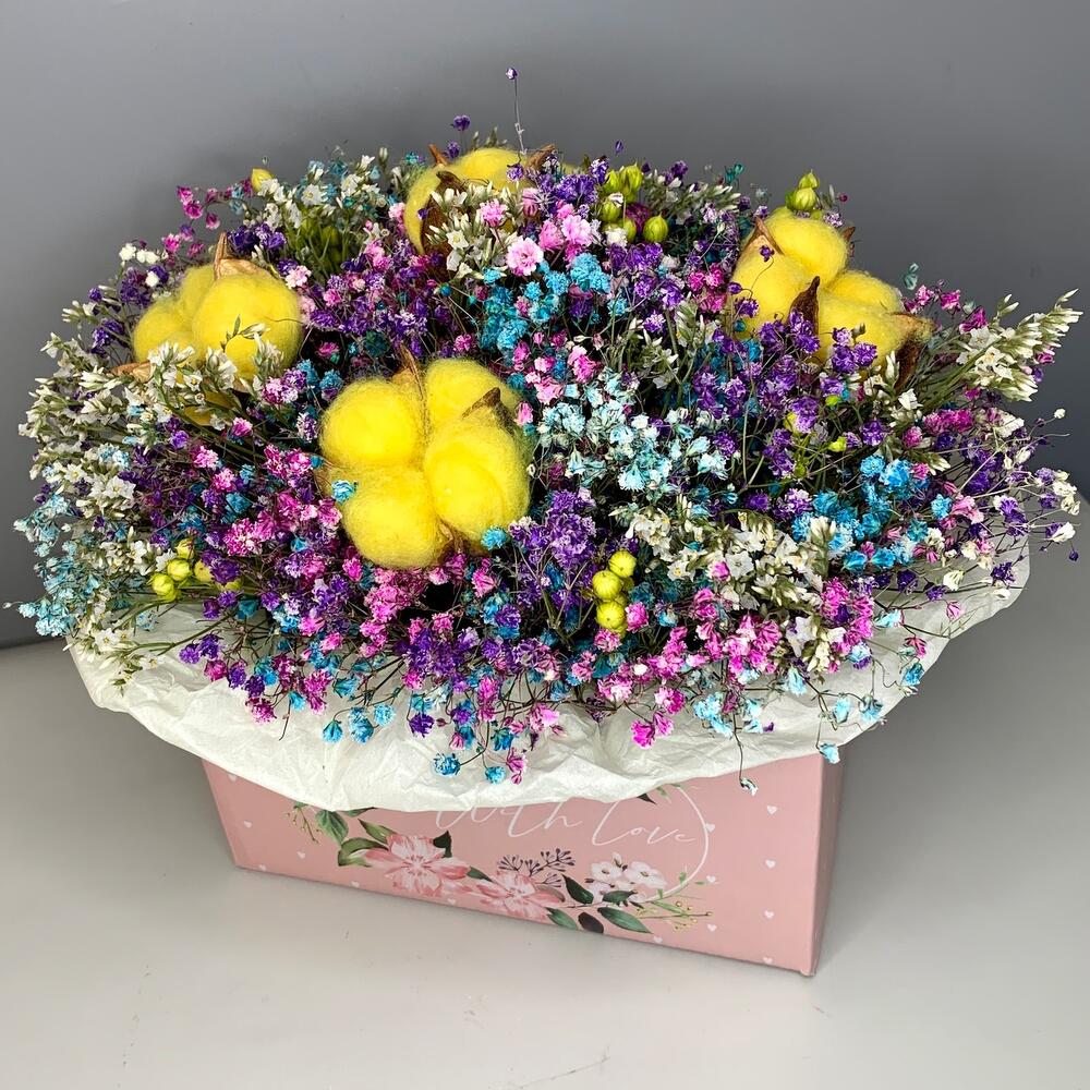 гипсофила сухоцвет – 10 шт.лимониум сухоцвет – 5 шт.Хлопок – 5 шт.абрус сухоцвет – 5 шт.Коробка – 1 шт.Оазис флористический – 1 шт.Тишью – 2 шт.Пленка прозрачная – 1 шт.Лента атласная – 2 шт.