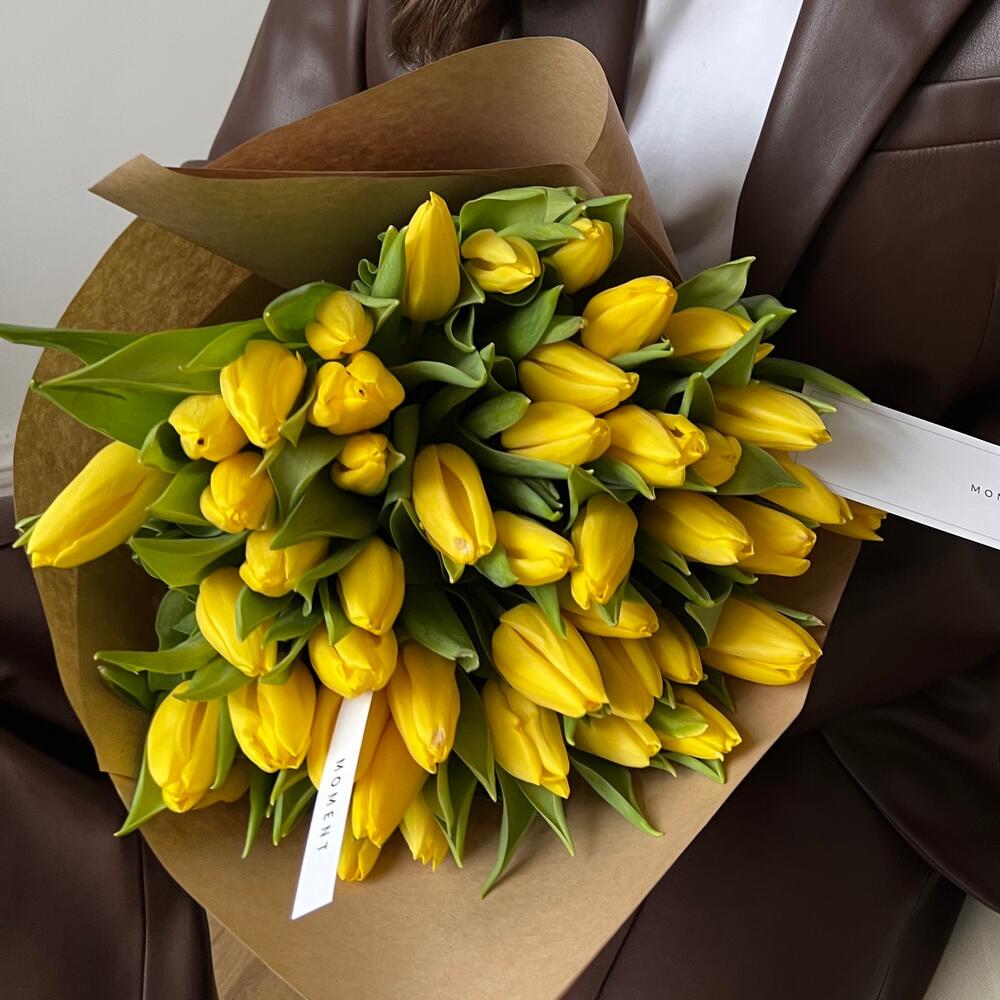 тюльпаны – 45 шт.Крафт – 1 шт.мягкий крафтовый пакет – 1 шт.Карточка для подписи – 1 шт.