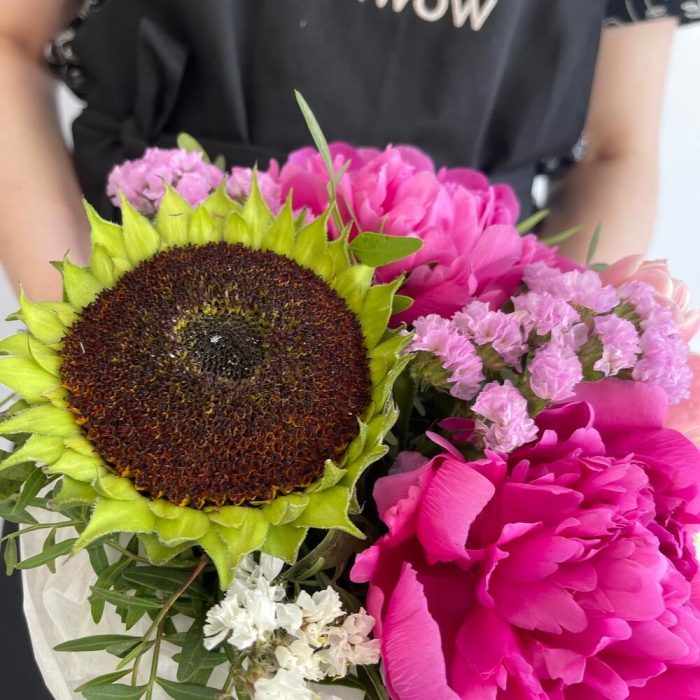 Пион – 2 шт.Тюльпан – 2 шт.Статица – 3 шт.Подсолнух – 1 шт.Тишью – 1 шт.Фисташка – 4 шт.Коробка шляпная – 1 шт.Оазис – 1 шт.